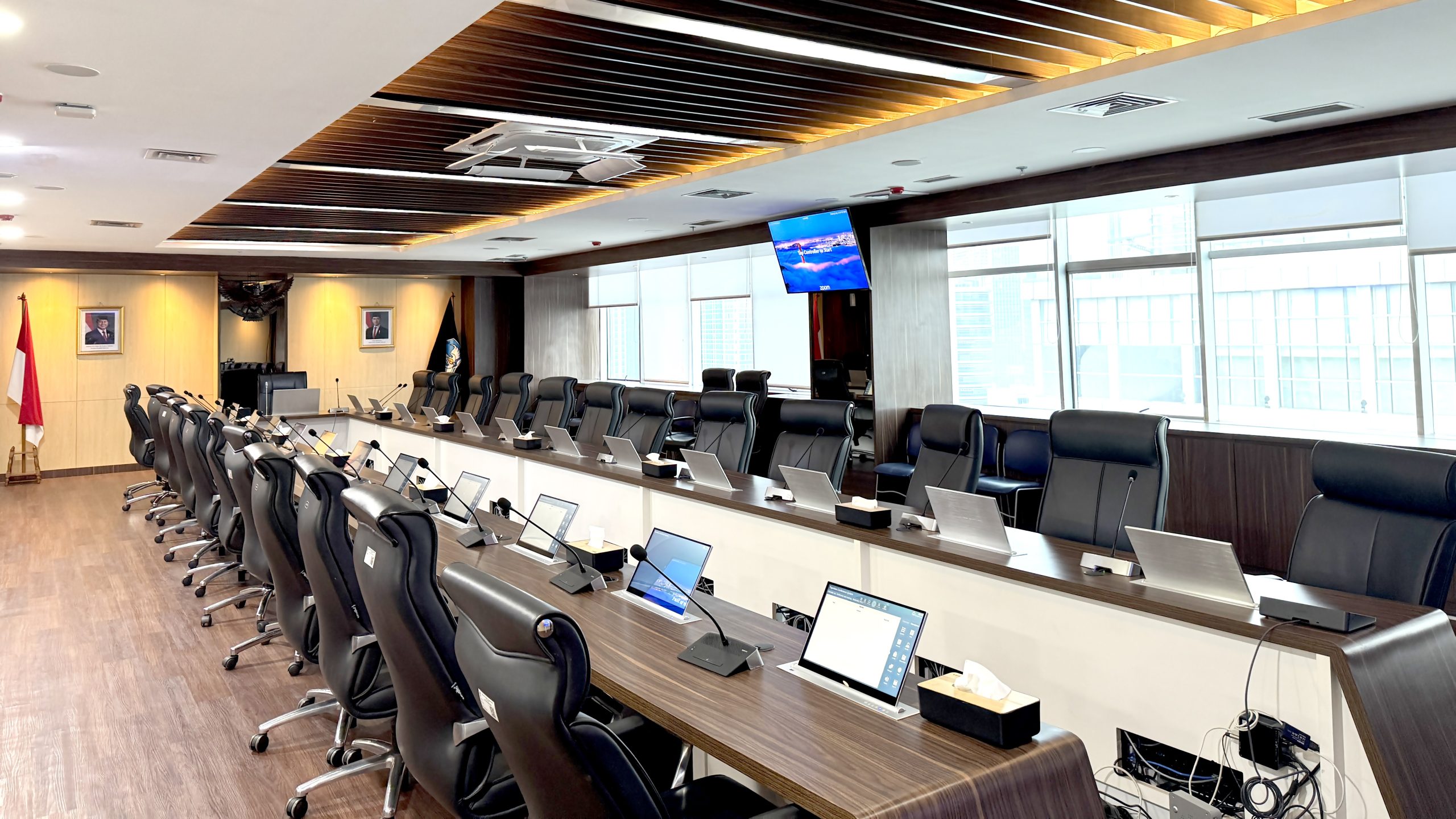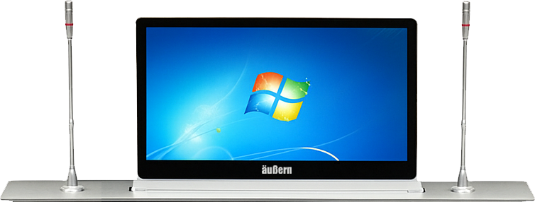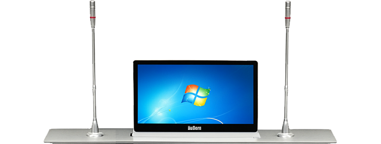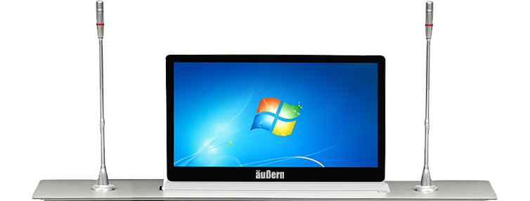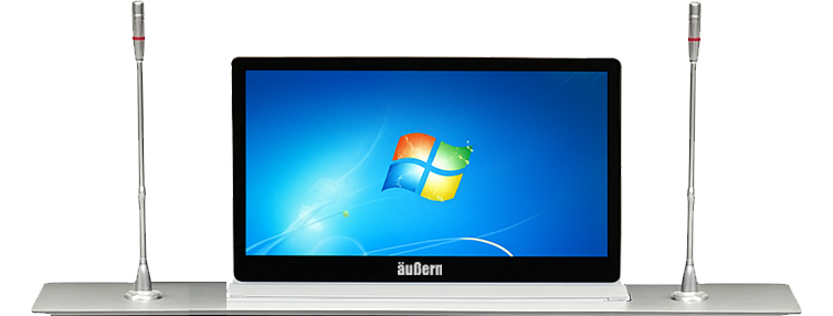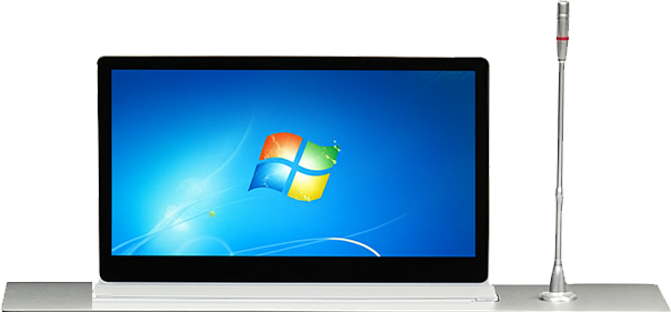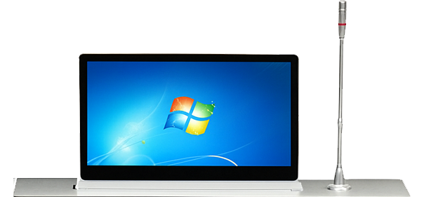 Sistem layar interaktif yang terpasang menyatu di dalam meja rapat, dilengkapi motor penggerak untuk menaikkan layar ke atas meja saat rapat digital dan menyembunyikannya kembali hingga rata dengan meja setelah selesai.